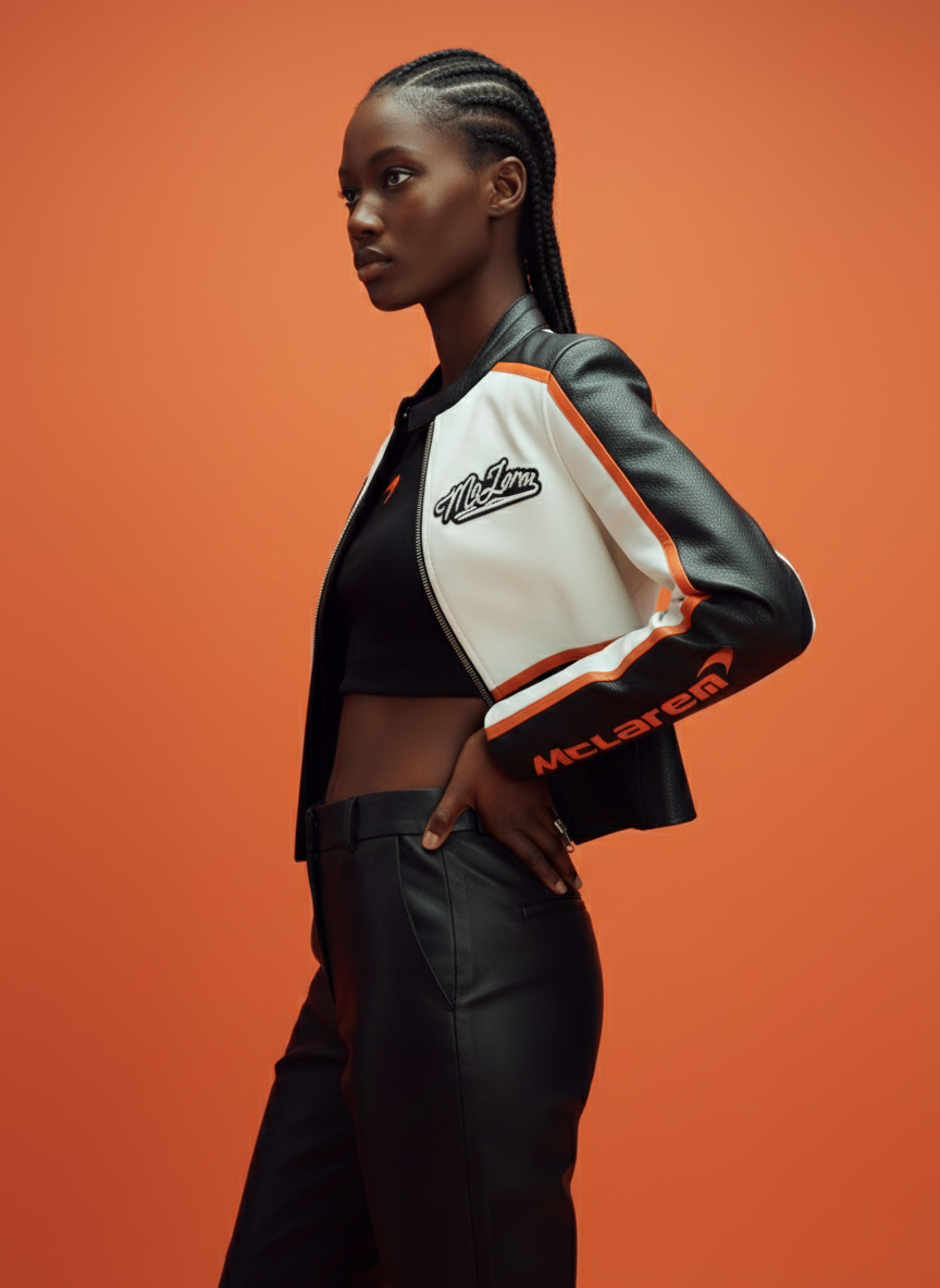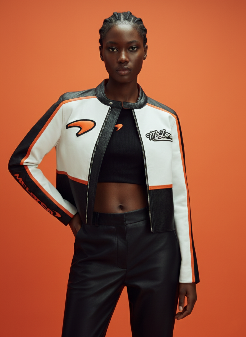 This stylish McLaren-inspired leather racing jacket features a modern, cropped silhouette designed for a high-fashion, athletic look. Combining premium materials with iconic automotive branding, it is a standout piece for fans of motorsport and contemporary streetwear.